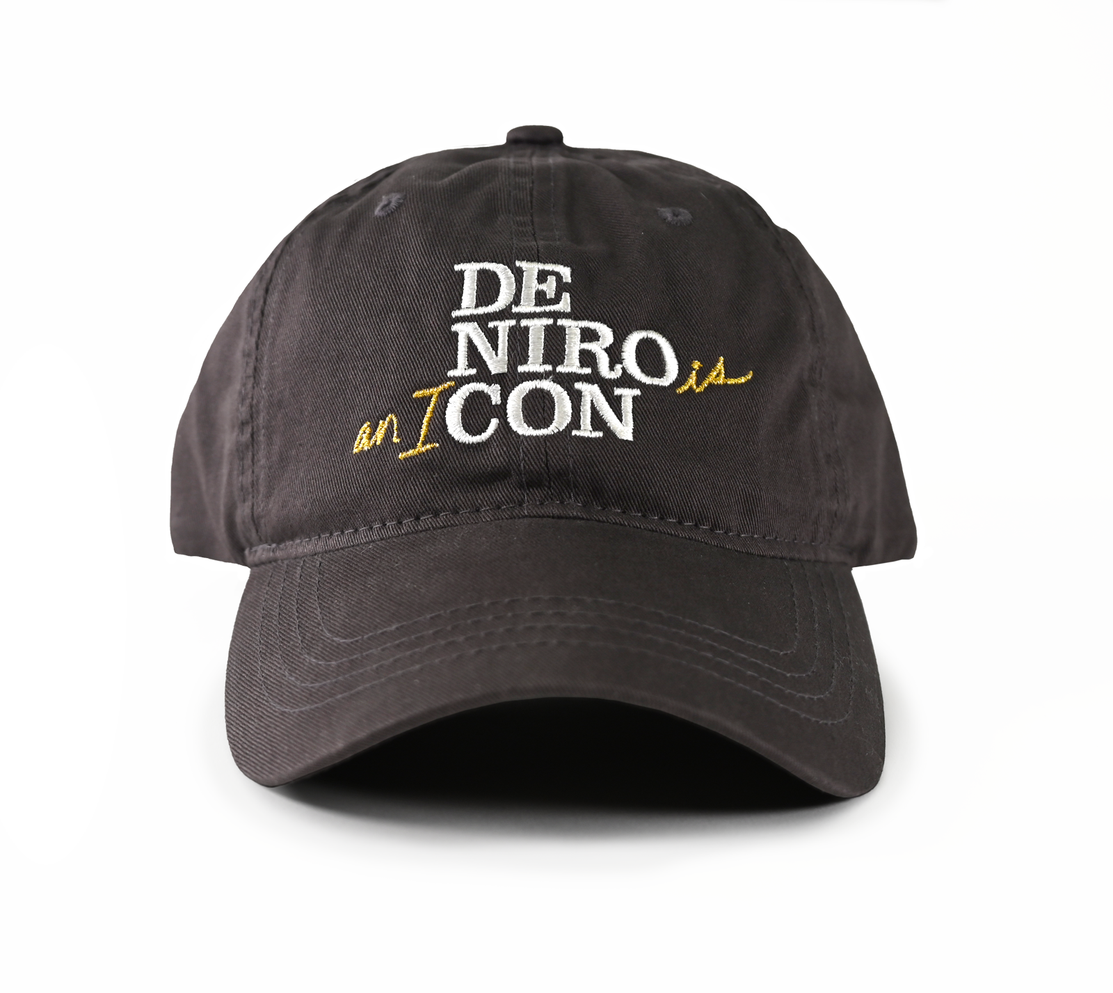 Black cotton cap with embroidered “DE NIRO is an ICON” in white and gold.